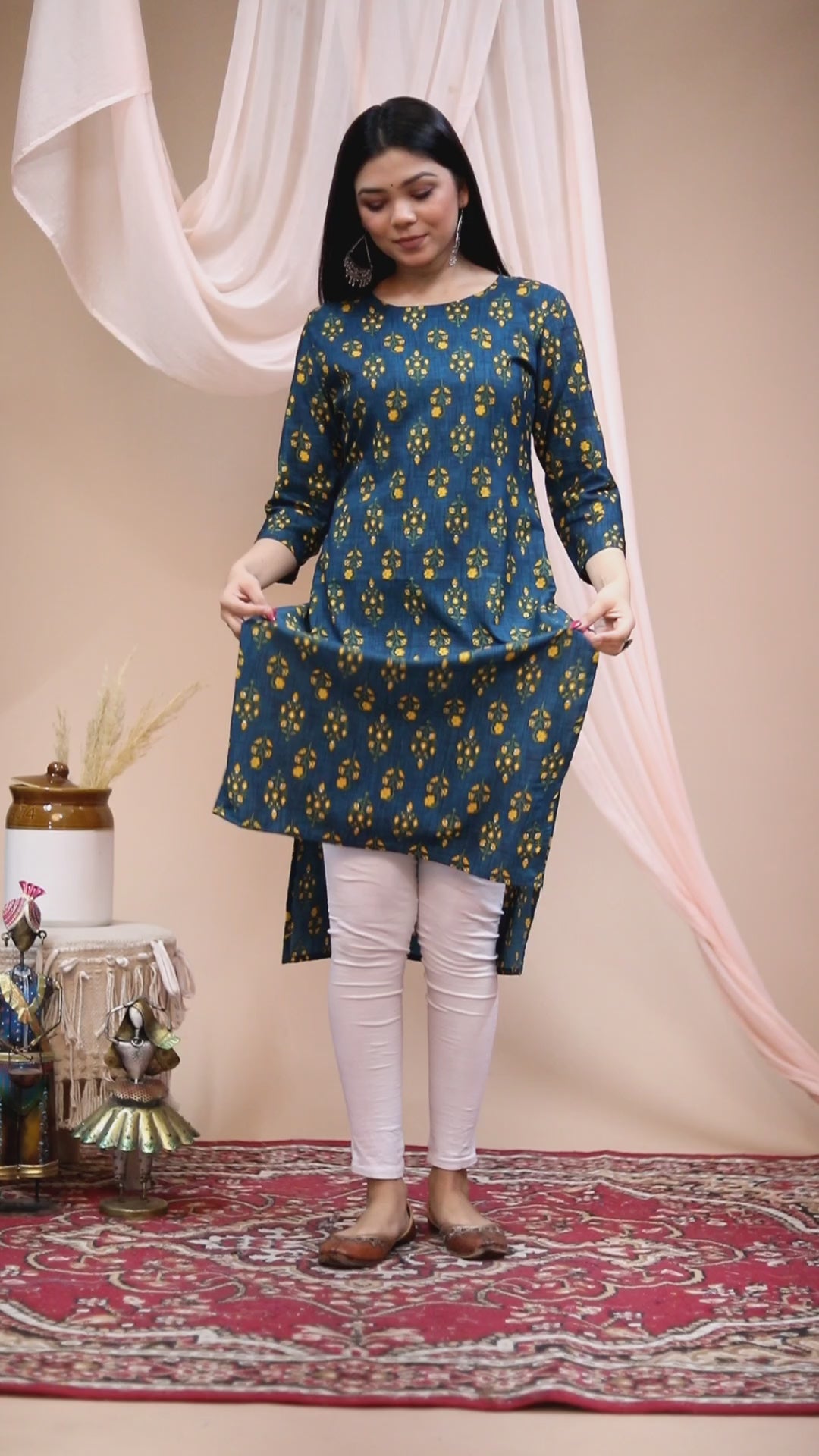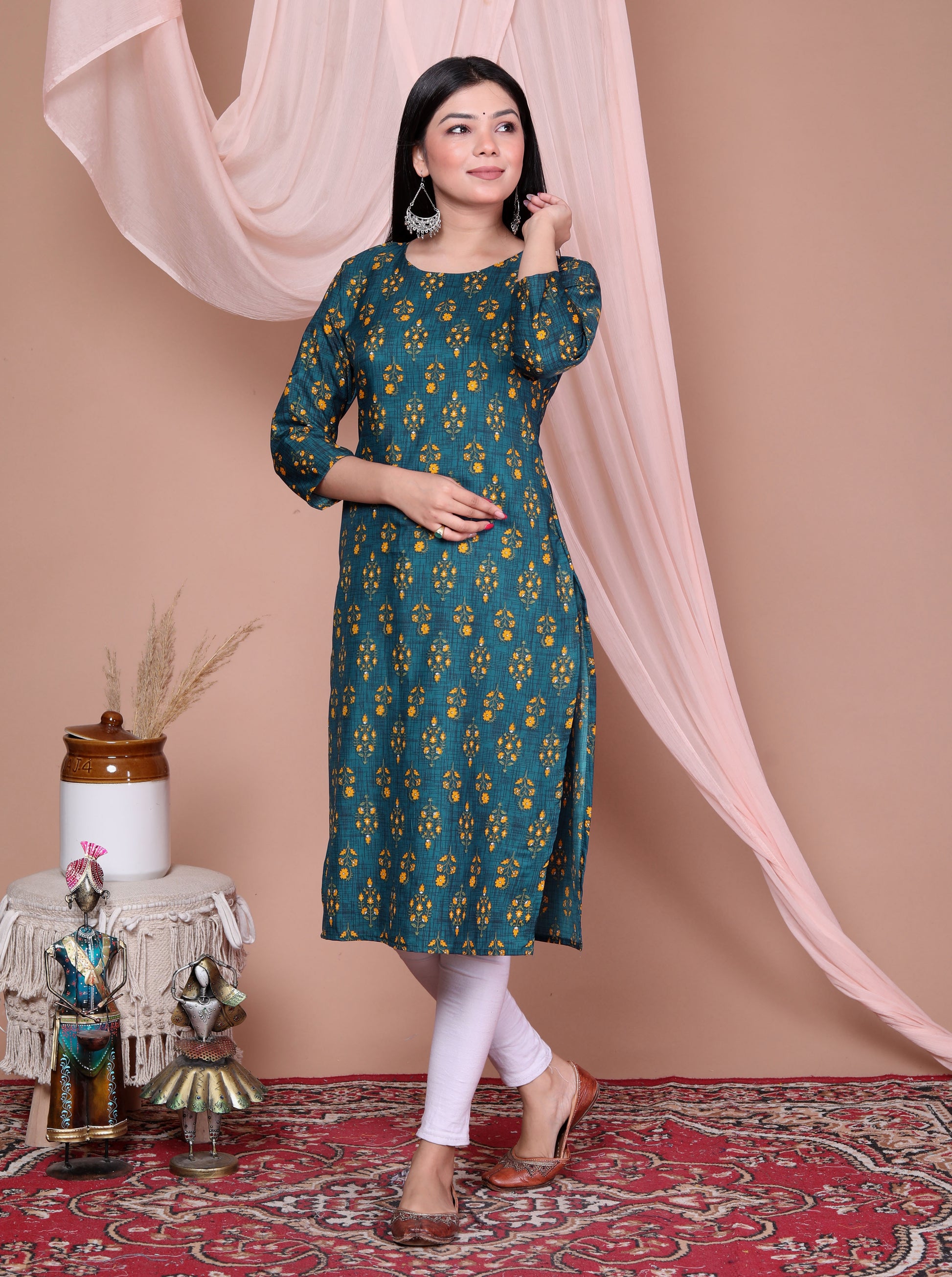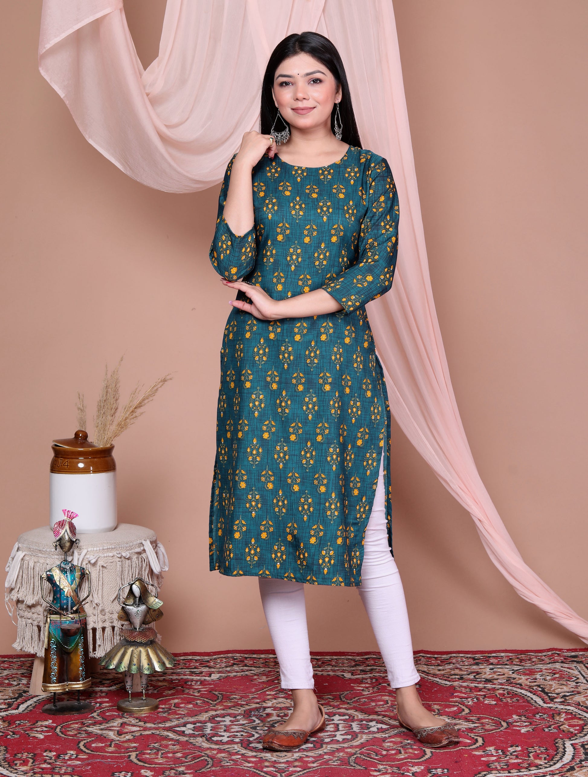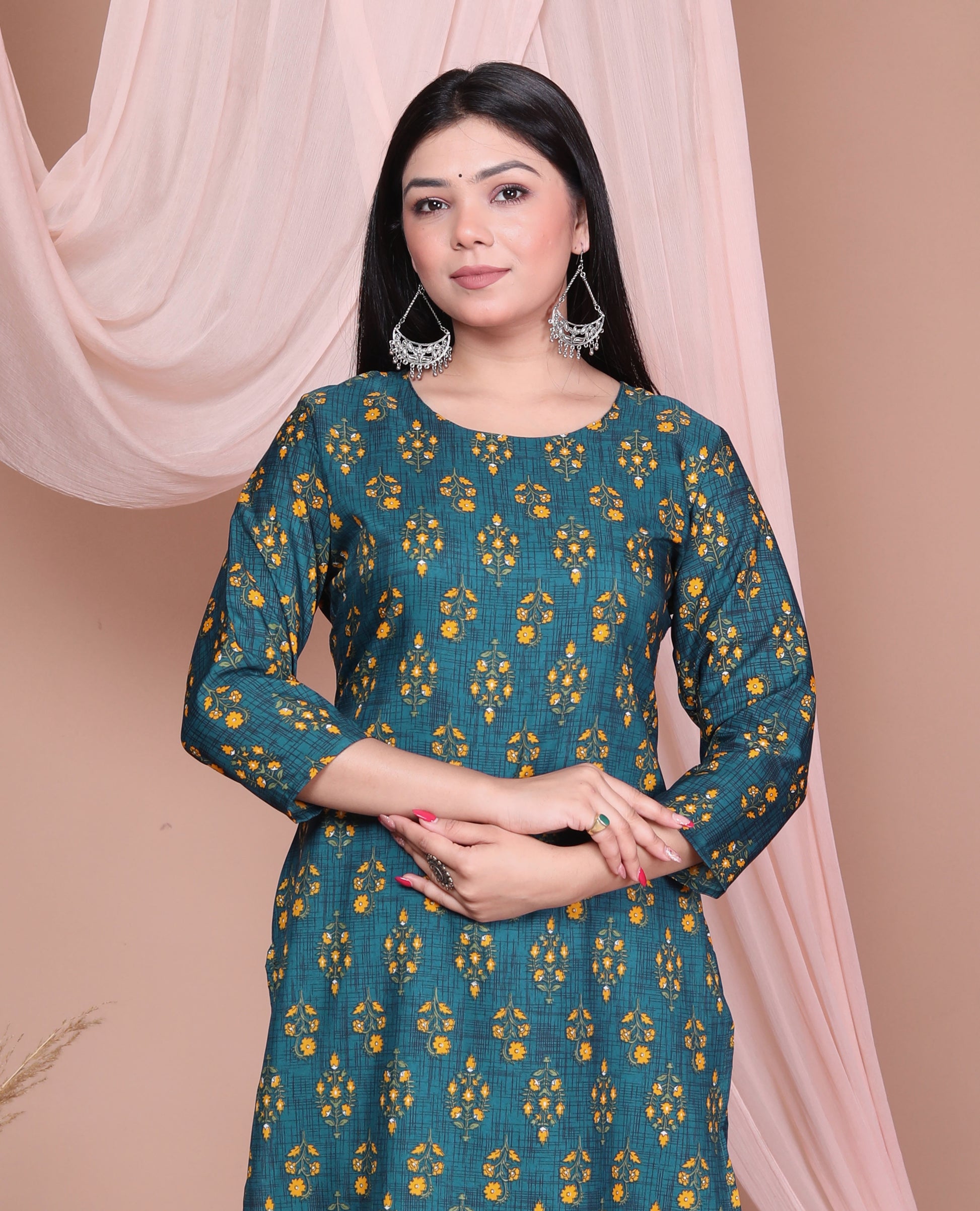 stay effortlessly stylish with this elegant green rayon kurti. Crafted from soft and breathable rayon fabric, it ensures day-long comfort and a graceful fall. Featuring a round neckline, three-quarter sleeves, and a straight-fit silhouette, this kurti blends simplicity with elegance — perfect for office wear, casual outings, or festive occasions
